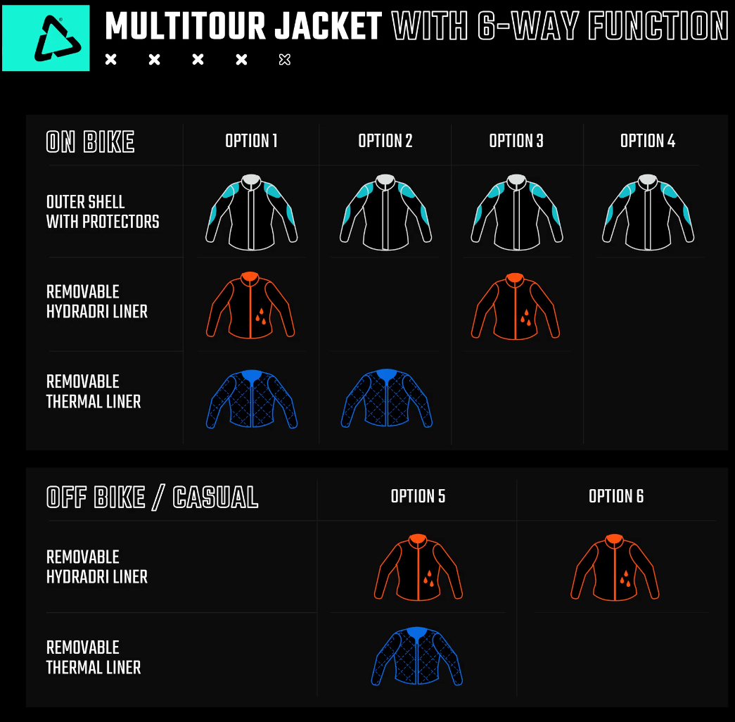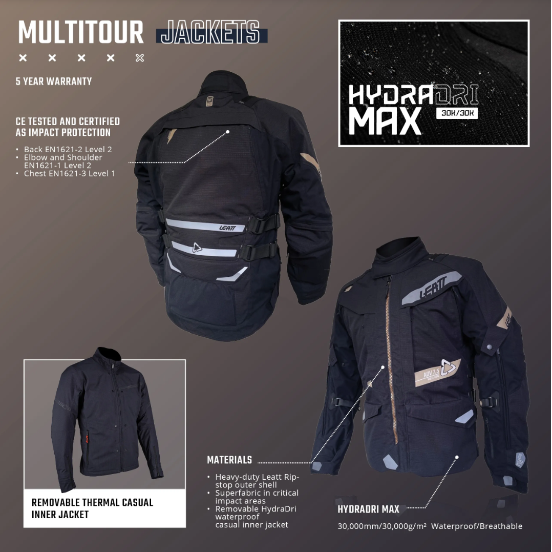 Complete with impact protection, the Leatt ADV Multitour 7.5 is a durable all-season jacket. It has six different ways in which it can be worn thanks to the light, ventilated outer layer, removable thermal liner and removable HydraDri MAX waterproof liner. Both the inner and outer layer can be used independently as light, casual jackets for either insulation or waterproof protection. This allows the jacket to adapt to any changing weather so you can continue your journey in safety and comfort.