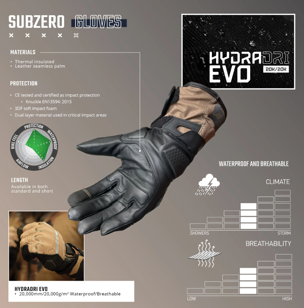 The Leatt Glove ADV Subzero 7.5 gloves provide safety in the extreme cold. Certified 3DF impact protection shields your hands and the HydraDri EVO membrane keeps them warm, dry and reactive. Thermal insulation ensures maximum comfort and grip, and an innovative screen wiper on the left thumb helps keep your vision clear.